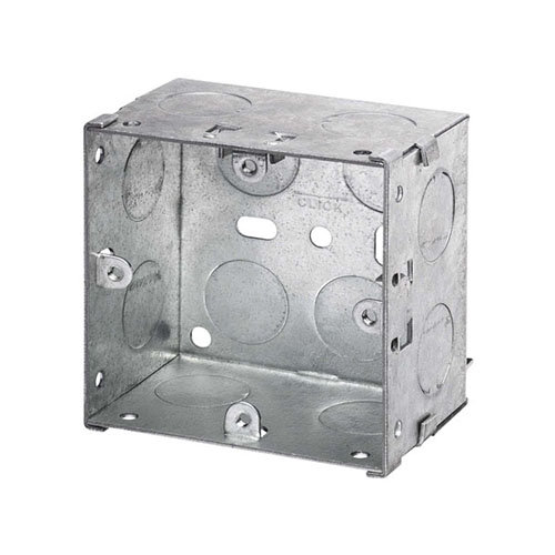 1 gang 35 mm metal back box manufactured from durable galvanised steel for flush mounting of electrical switches and sockets. Designed with multiple knockouts to allow easy cable or conduit entry during installation. Suitable for residential, commercial, and industrial electrical installations, providing secure housing for wiring connections and accessories within walls or partition systems.