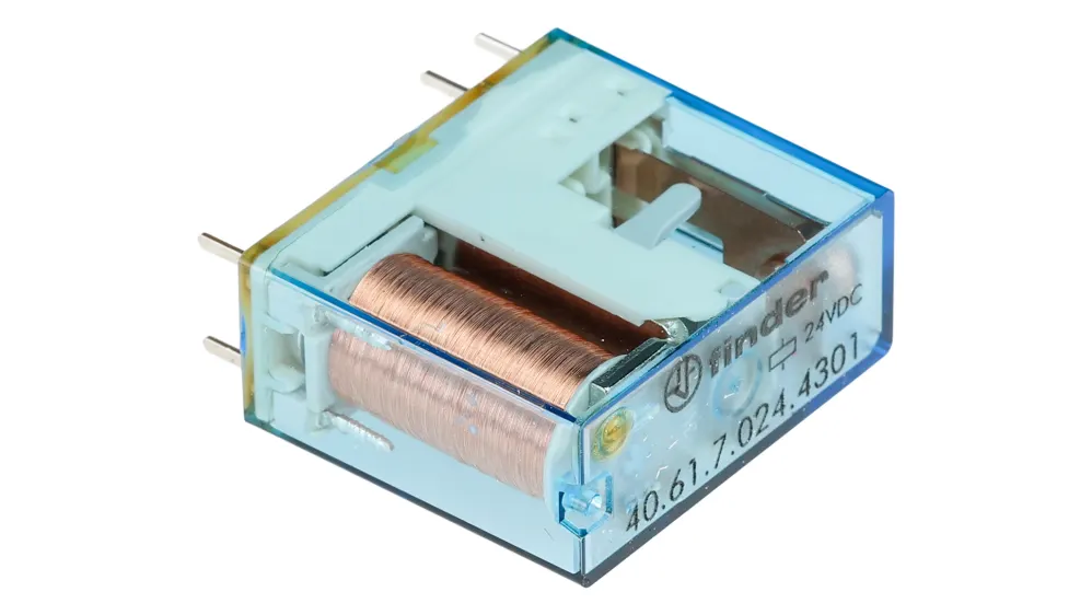 Finder PCB power relay is designed for reliable switching in control and electronic circuits. It features a 24 V DC coil, 16 A switching current, and SPDT contact configuration, making it suitable for a wide range of industrial and PCB-mounted applications.