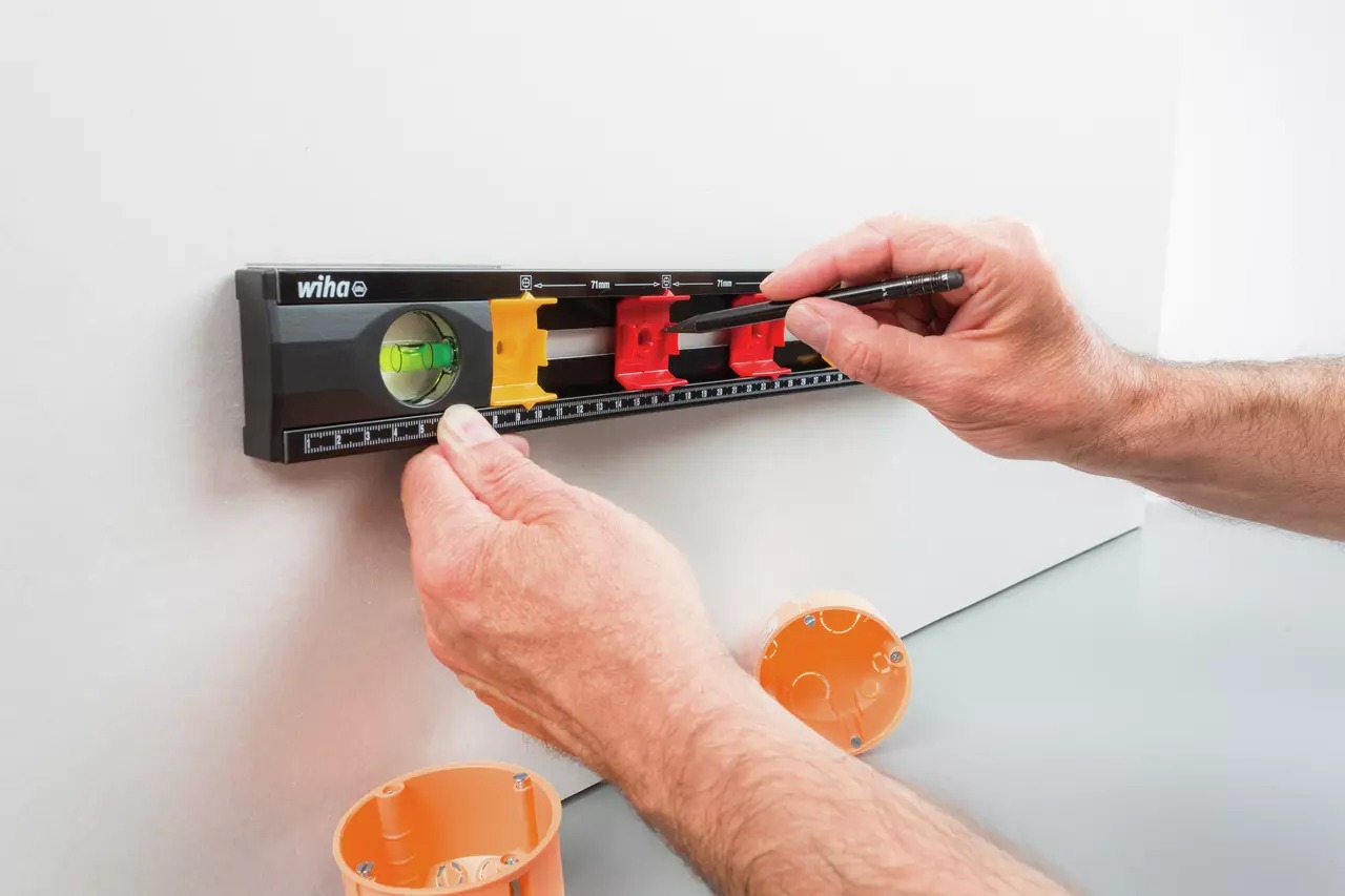 All too often electricians find it difficult to see the bubble in spirit levels when installing socket outlets in the floor. They may also leave unsightly edges when marking positions due to bubbles shifting as they mark lines. The Wiha electrician’s spirit level now puts an end to such problems. Users can see its bubbles perfectly, even from a sharp angle. The spirit level also allows electricians to mark out lines without needing to stop thanks to an end-to-end casing. The ingeniously positioned linear scales ensure users can measure in comfort, even when viewing from above. The variable distance marks for up to four flush socket boxes bring another advantage to electrical installation work. The sliding marking points for boxes allow the spirit level to be adjusted to the marking distances required by local regulations. This means the level can be used in a wide variety of situations, even on an international level. Thanks to its compact dimensions, it is also perfect for portable use and can be stored away in the Wiha electrician’s case.